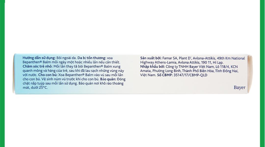 Bepanthen Balm là sản phẩm được sản xuất bởi Farma SA và nhập khẩu bởi Công ty TNHH Bayer Việt Nam - một trong những công ty hàng đầu cung cấp các sản phẩm tiên tiến hỗ trợ cải thiện chất lượng cuộc sống của người Việt Nam trong nhiều lĩnh vực điều trị và chăm sóc y tế. Công ty TNHH Bayer Việt Nam thuộc Tập đoàn Bayer đã hoạt động tại Việt Nam từ năm 1994 với hai nhà máy sản xuất hiện đại, hỗ trợ hoạt động kinh doanh chung của toàn công ty. Với nhánh dược phẩm, Bayer tập trung vào các sản phẩm thuốc kê toa, đặc biệt là lĩnh vực tim mạch và chăm sóc sức khỏe phụ nữ, thuốc cản quang trong chẩn đoán hình ảnh và thuốc đặc trị trong ung thư, huyết học và nhãn khoa. Nhánh Chăm sóc sức khỏe người tiêu dùng chủ yếu phát triển các sản phẩm thuốc không kê toa, với mục tiêu hỗ trợ người tiêu dùng tự chăm sóc để có cuộc sống khỏe mạnh và hạnh phúc.