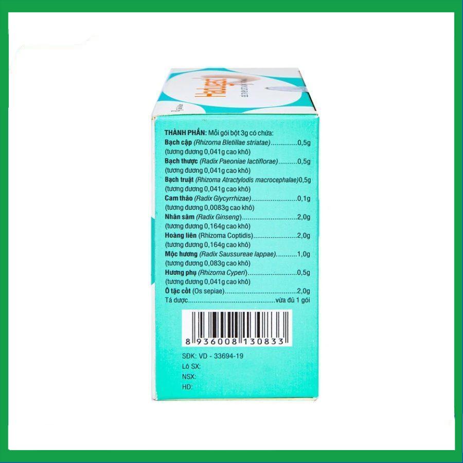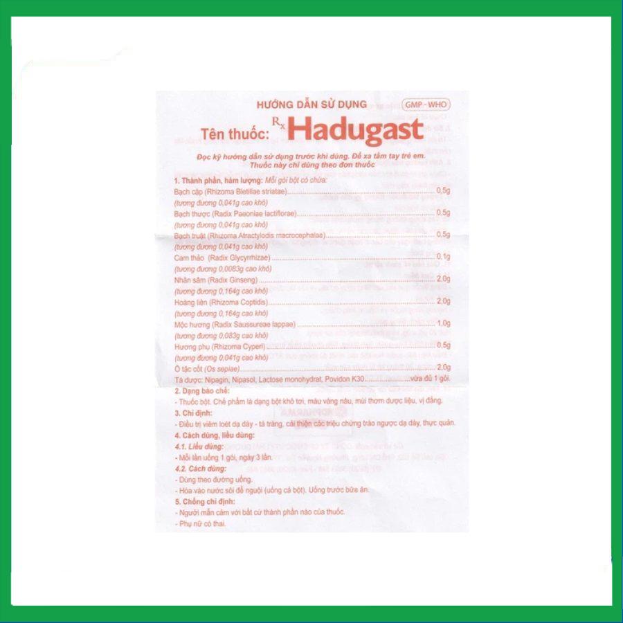 Hadugast Hải Dương 20 Gói X 3G của công ty CP Dược VTYT Hải Dương, thành phần chính bạch cập, bạch thược, bạch truật, cam thảo, nhân sâm, hoàng liên, mộc hương, hương phụ, ô tặc cốt, là thuốc dùng để điều trị viêm loét dạ dày – tá tràng, cải thiện triệu chứng trào ngược dạ dày, thực quản.