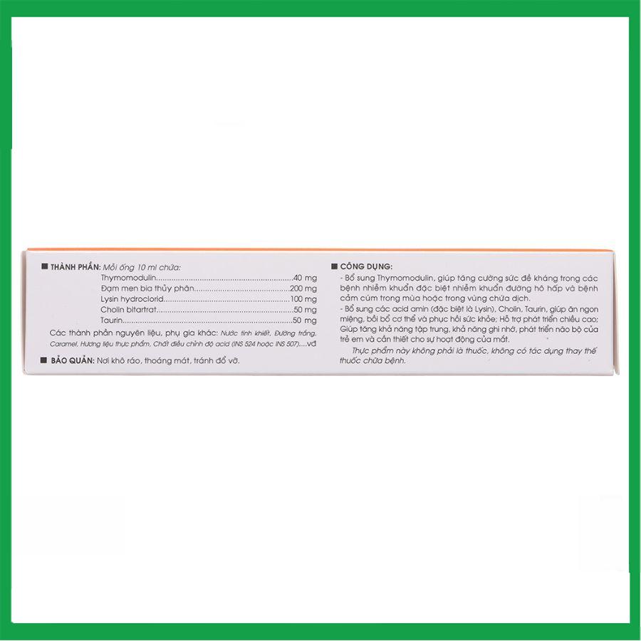 Lysin: Tăng cường hấp thu canxi, giúp kích thích trẻ ăn ngon miệng, tăng cường chuyển hóa chất dinh dưỡng và phát triển chiều cao, giảm mệt mỏi.