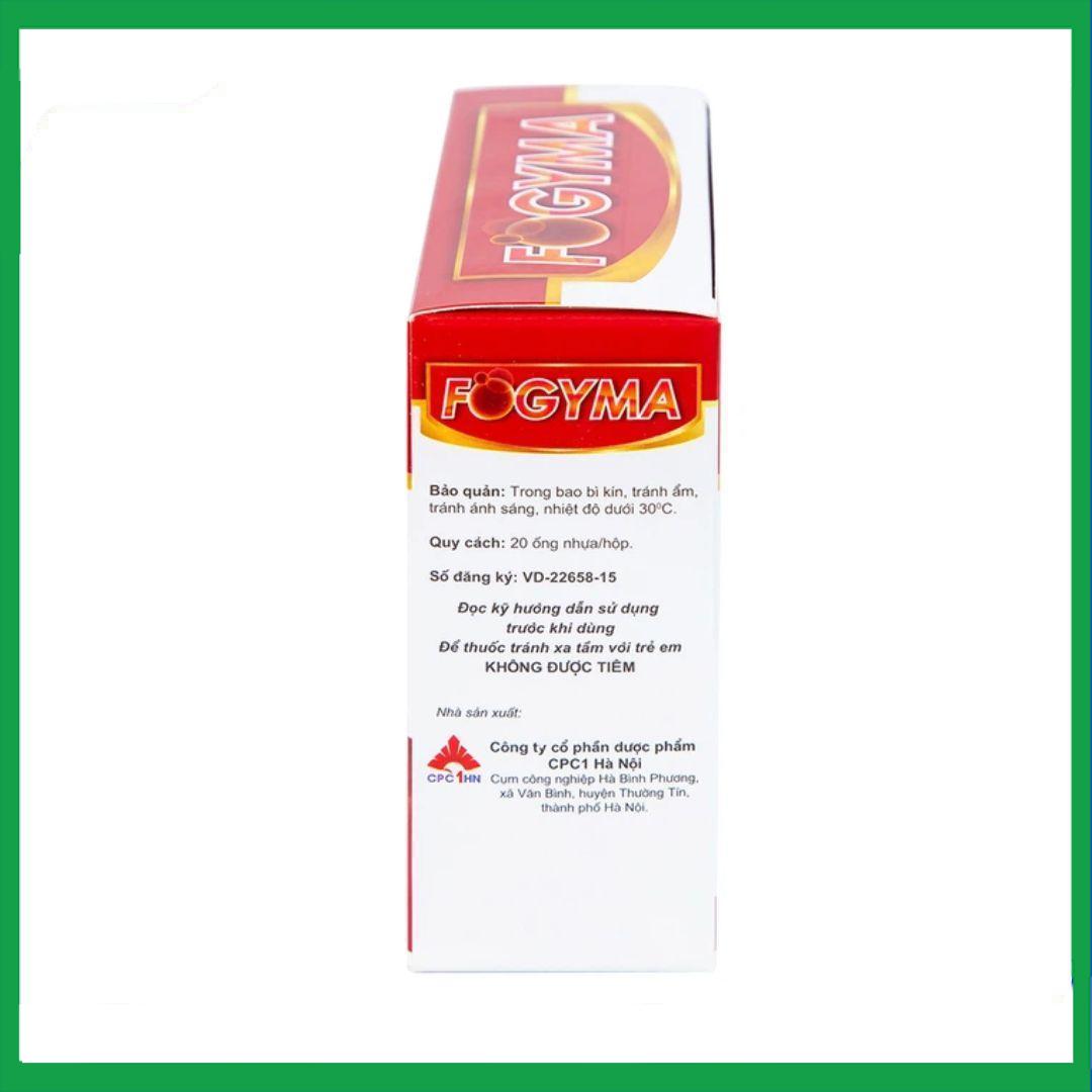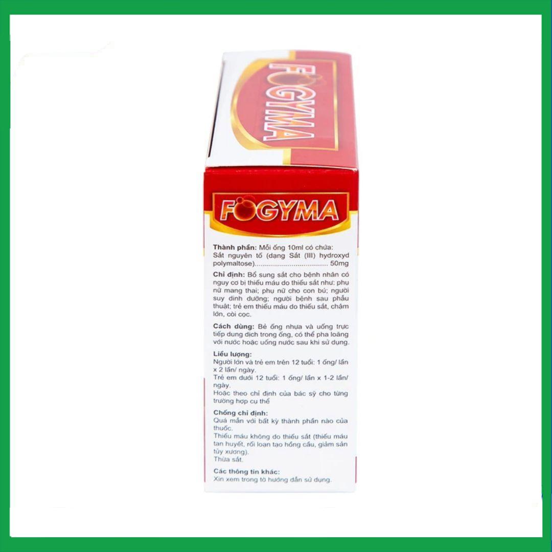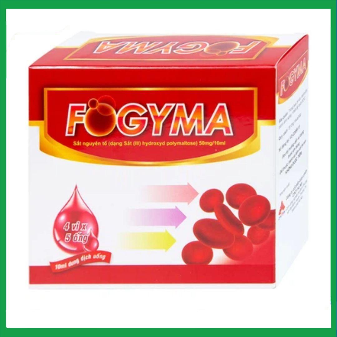 Thuốc Fogyma được sản xuất bởi Công ty Cổ phần Dược phẩm CPC1 Hà Nội, có chứa Sắt nguyên tố dưới dạng phức hợp sắt (III) hydroxyd polymaltose, được chỉ định để bổ sung sắt cho bệnh nhân có nguy cơ bị thiếu máu do thiếu sắt như phụ nữ mang thai, phụ nữ cho con bú, người suy dinh dưỡng, người bệnh sau phẫu thuật, trẻ em thiếu máu do thiếu sắt, chậm lớn, còi cọc.
