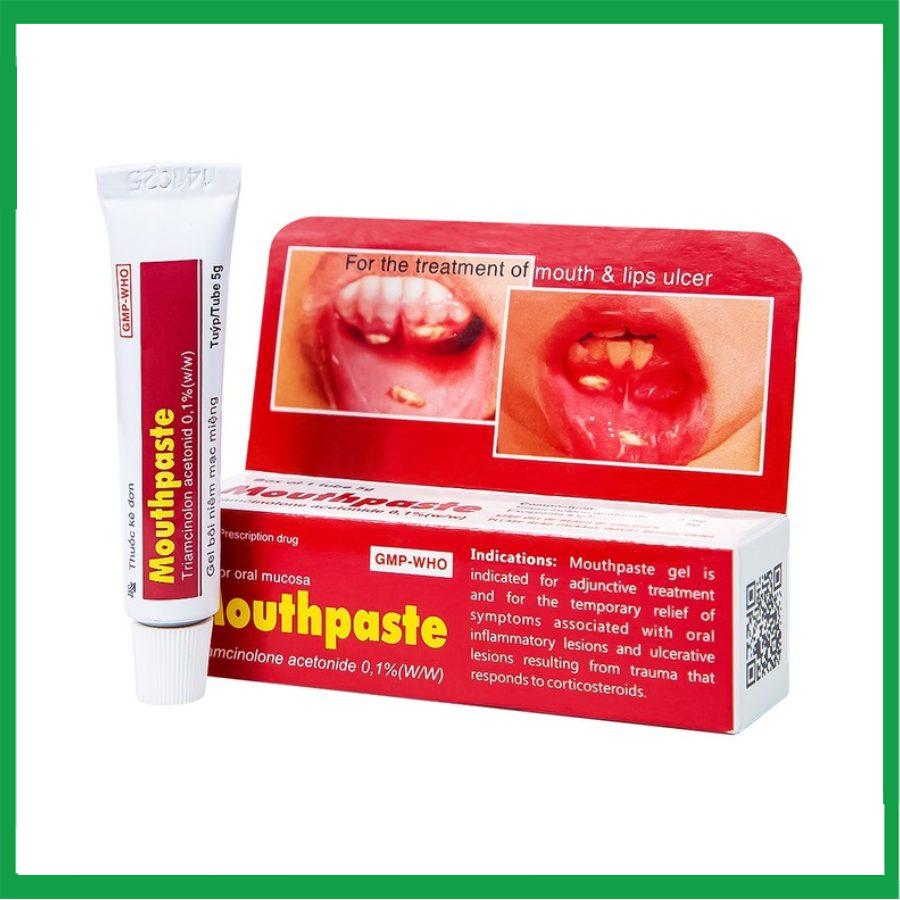 Thuốc Mouthpaste của Công ty Cổ phần Dược Medipharco, có thành phần chính là triamcinolon acetonid được dùng để điều trị hỗ trợ và làm giảm tạm thời các triệu chứng liên quan đến các tổn thương ở niêm mạc miệng, lợi, môi và các tổn thương loét ở niêm mạc miệng do chấn thương có đáp ứng với corticoid.