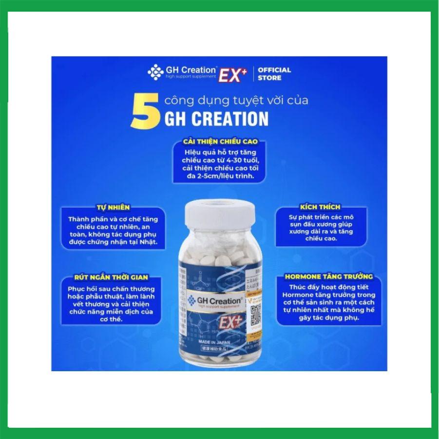 - Viên uống tăng chiều cao GH Creation EX giúp bổ sung các nguồn acid amin, canxi. Nhờ đó, có thể giúp hỗ trợ thúc đẩy sự phát triển của hormone tăng trưởng chiều cao GH.
