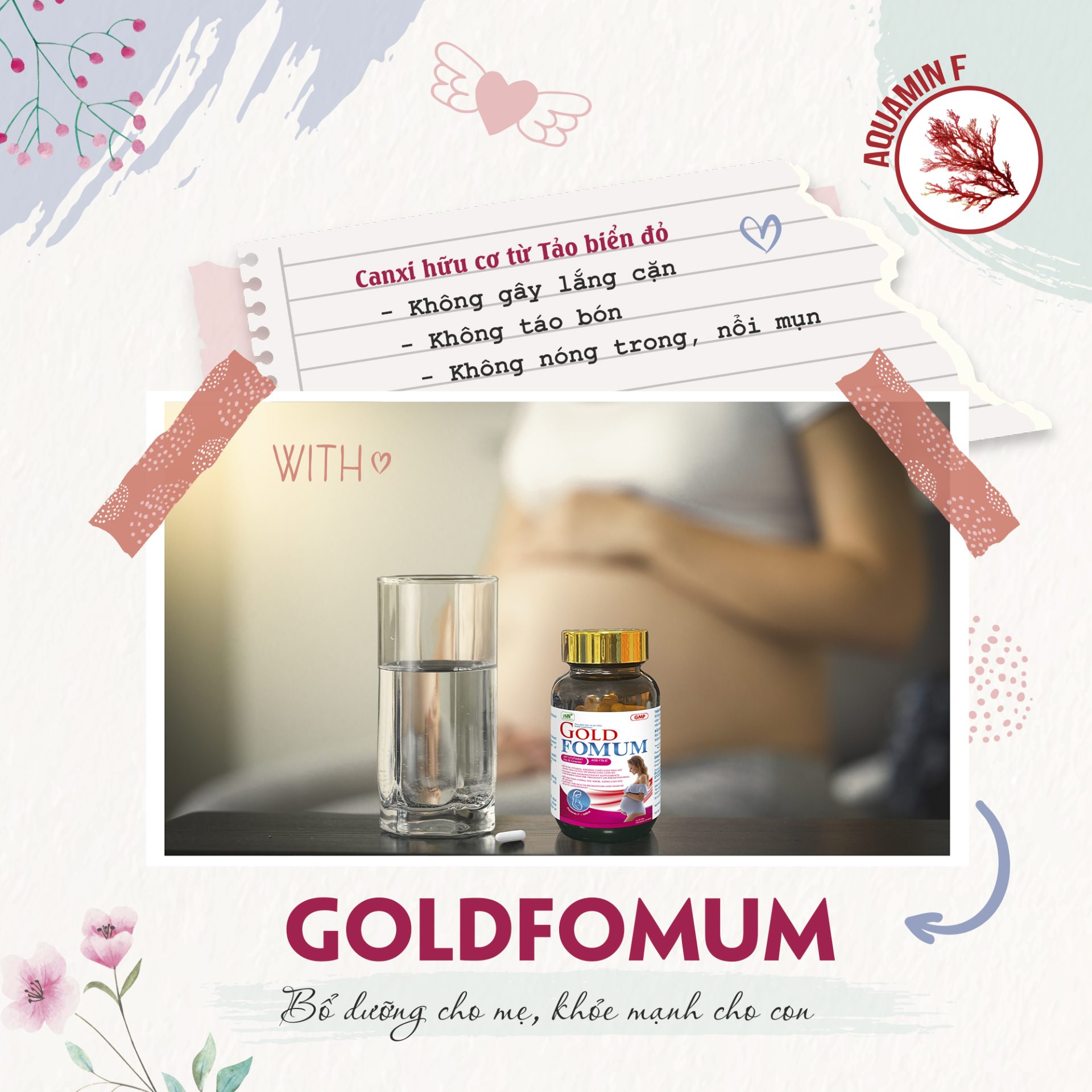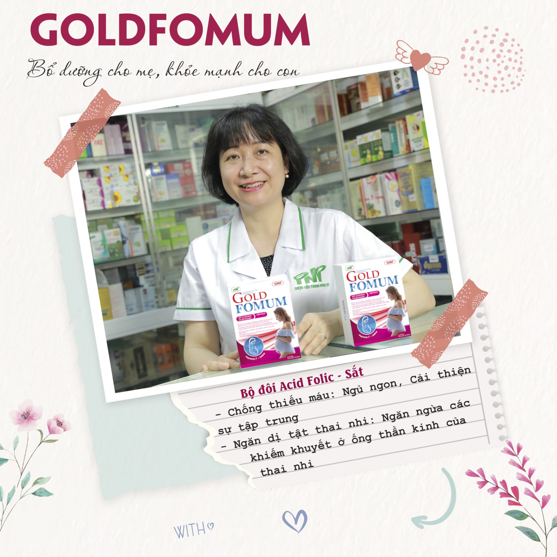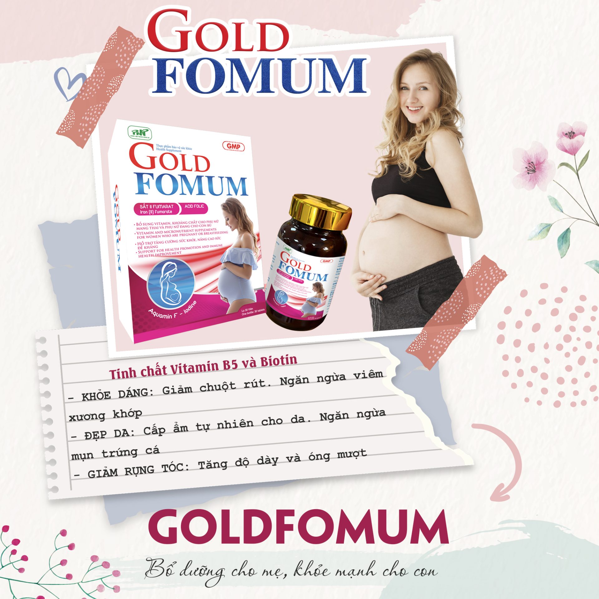Goldfomum được Cục ATTP – Bộ Y Tế cấp phép, có công dụng hỗ trợ bổ sung khoáng chất, vitamin cần thiết cho phụ nữ có thai và phụ nữ đang cho con bú. Hỗ trợ nâng cao sức đề kháng, tăng cường sức khỏe.