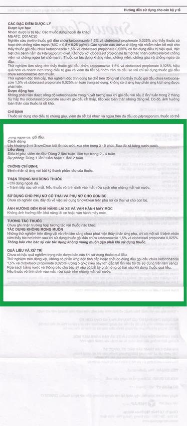 Dùng ngoài da, gội đầu. Lấy khoảng 5 ml Snowclear bôi lên tóc ướt, xoa nhẹ trong 3 - 5 phút. Sau đó xả bằng nước sạch.Liều dùng