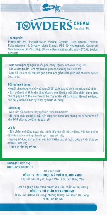 Towders Cream chứa thành phần chính Permethrin 5%, có tác dụng loại sạch các loại ký sinh trùng trên da bao gồm cái ghẻ, rận mu và nhiều loại khác.