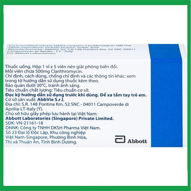 Thuốc Klacid MR 500 mg dạng viên nén là sản phẩm của Công ty Abbott, có thành phần chính là Clarithromycin. Thuốc được dùng để điều trị các nhiễm trùng gây ra bởi các vi khuẩn nhạy cảm: Nhiễm trùng đường hô hấp dưới như viêm phế quản cấp và mạn tính, viêm phổi, nhiễm trùng đường hô hấp trên như viêm xoang và viêm họng, viêm tai giữa.