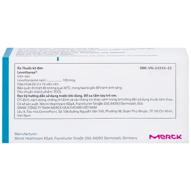 Thuốc Levothyrox 100µg là sản phẩm của Công Ty Merck (Đức), thành phần chính levothyroxin natri 100mcg. Đây là thuốc được sử dụng để điều trị tuyến giáp hoạt động kém (suy giáp). Thuốc thay thế hoặc cung cấp hormon tuyến giáp, thường được tạo ra bởi tuyến giáp. Nồng độ hormon tuyến giáp thấp có thể tự xảy ra hoặc khi tuyến giáp bị tổn thương do bức xạ, do thuốc hoặc bị loại bỏ khi phẫu thuật. Việc có đủ hormon tuyến giáp rất quan trọng cho việc duy trì bình thường hoạt động tinh thần và thể chất ở người lớn cũng như trẻ em. Thuốc này cũng được sử dụng để điều trị các loại bệnh rối loạn tuyến giáp khác (như bướu giáp, ung thư tuyến giáp) Sản phẩm cần tư vấn từ dược sỹ. |