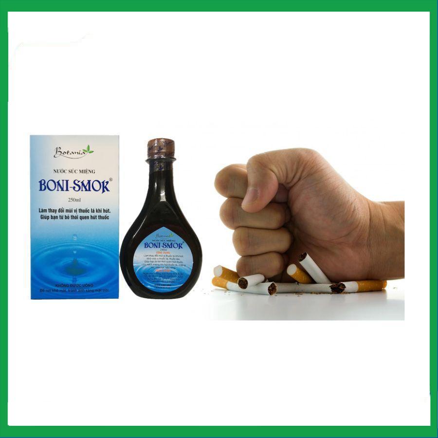 - Nước súc miệng Boni-Smok là một trong những giải pháp được nhiều người lựa chọn để cai thuốc lá. Khi súc miệng đúng, nước Boni-Smok bao phủ toàn bộ khoang miệng. Sau đó, bạn hút thuốc luôn thì các thành phần có trong nước súc miệng phản ứng với nicotine trong khói thuốc tạo thành vị đắng, người hút thuốc không còn cảm nhận thấy vị ngon của điếu thuốc, làm họ chán mùi khói thuốc. Từ đó, giúp cắt cơn thèm thuốc và dần dần từ bỏ thói quen hút thuốc lá hiệu quả.