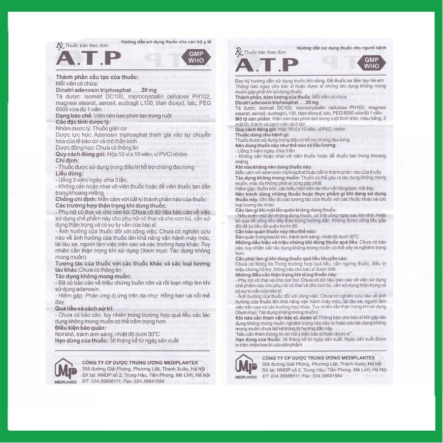 A.T.P 20 mg của Công ty Cổ phần Dược Trung ương Mediplantex, thành phần chính là Dinatri adenosin triphosphate, có công dụng điều trị suy tim, hoạt động cơ kém, bệnh lý dạ dày… Thuốc còn được chỉ định dùng trong điều trị hỗ trợ chứng đau lưng.