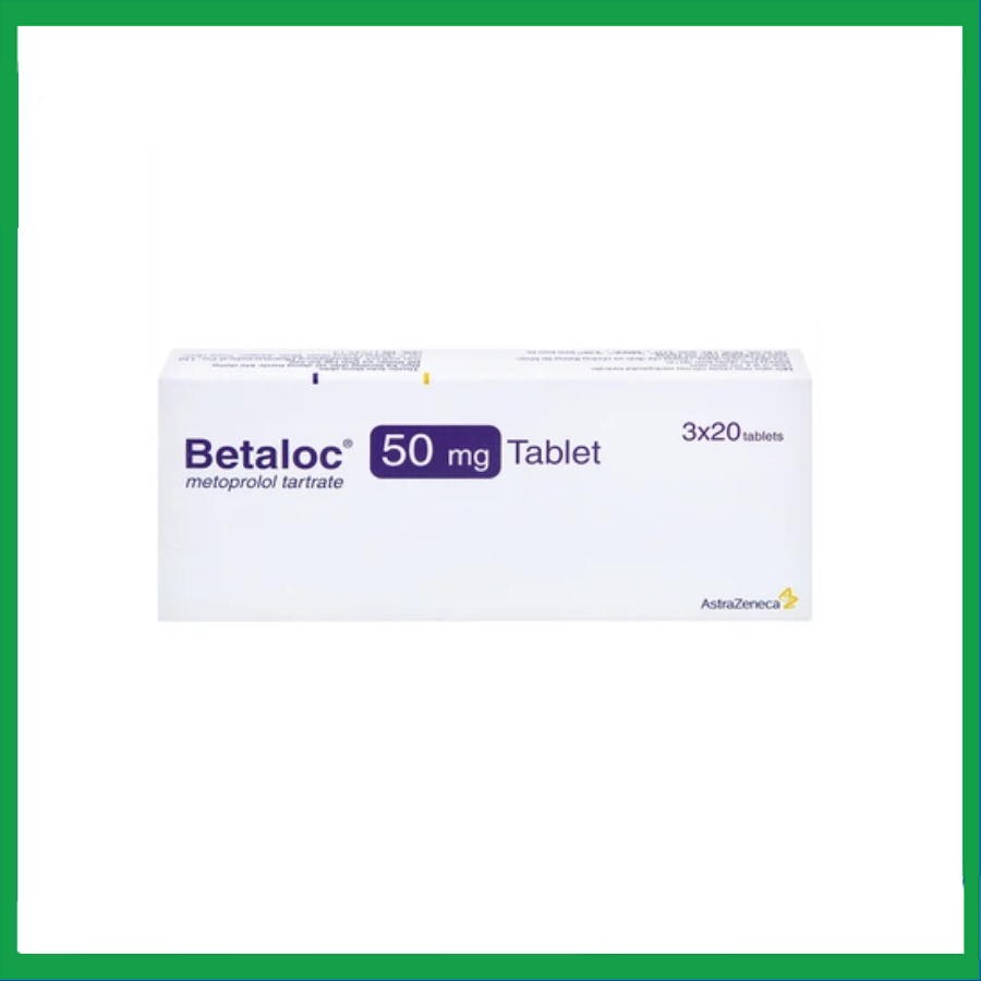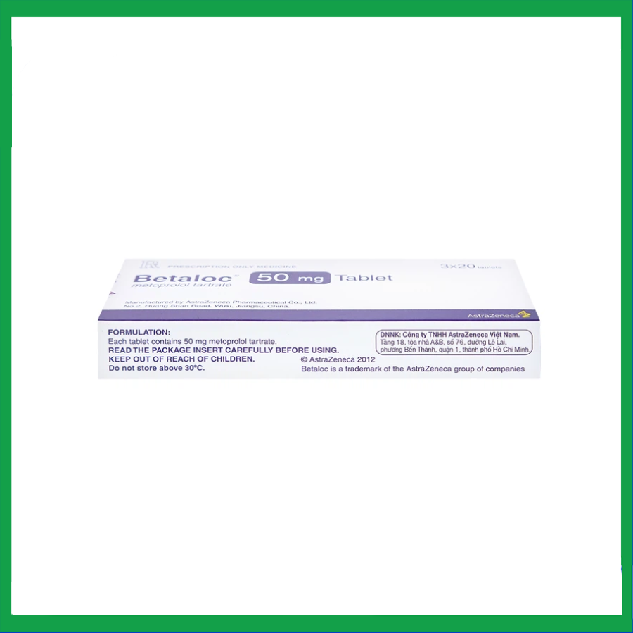 Betaloc 50 mg của công ty AstraZeneca Pharmaceutical Co., Ltd. Trung Quốc, thành phần chính là metoprolol tartrate. Đây là thuốc điều trị tăng huyết áp; dự phòng đau thắt ngực; điều trị một số rối loạn nhịp tim nhanh; điều trị duy trì sau nhồi máu cơ tim; rối loạn chức năng tim có kèm đánh trống ngực.
