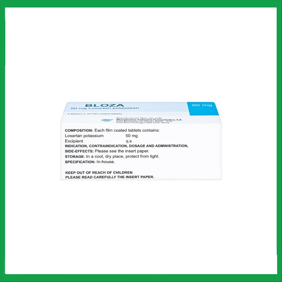 Bloza là thuốc sản xuất bởi công ty Bluepharma Indústria Farmaceutica S.A, thành phần chính gồm losartan, điều trị tăng huyết áp.Bloza được bào chế dưới dạng viên nén bao phim. Quy cách đóng gói gồm hộp 6 vỉ x 10 viên.