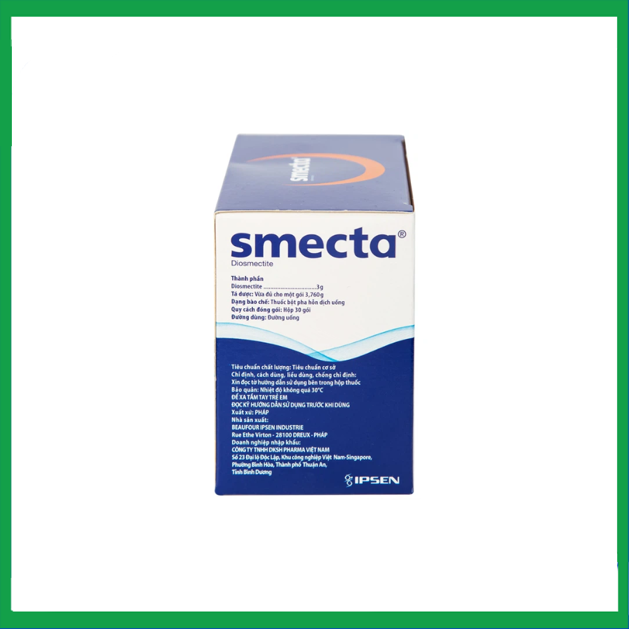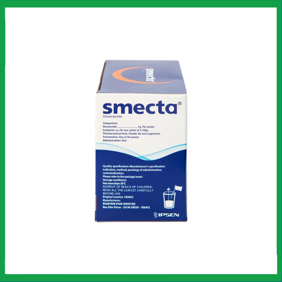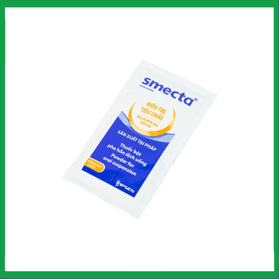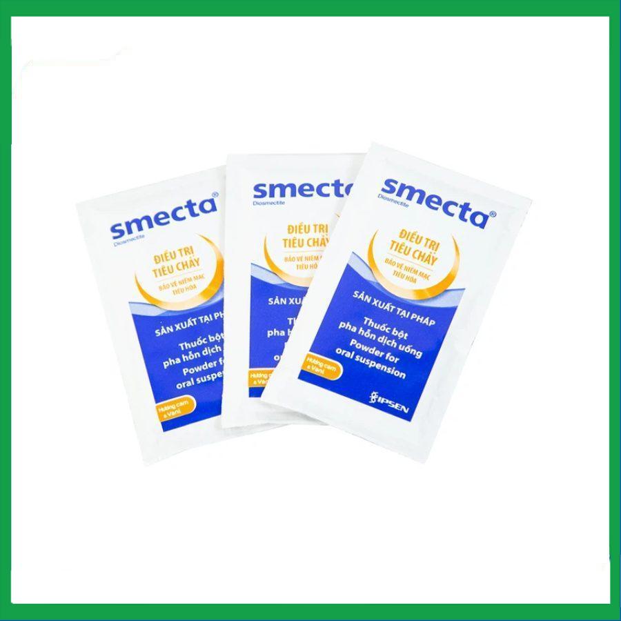 Smecta là thuốc điều trị tiêu chảy theo cơ chế hấp phụ, với hoạt chất chính Diosmectit 3g, tá dược: Glucose monohydrate, natri saccharin, hương cam*, hương vani* . Đóng gói thành hộp chứa 30 gói bột pha hỗn dịch uống.