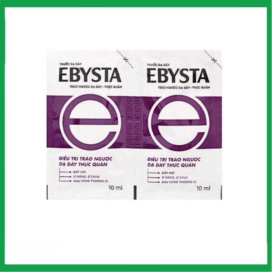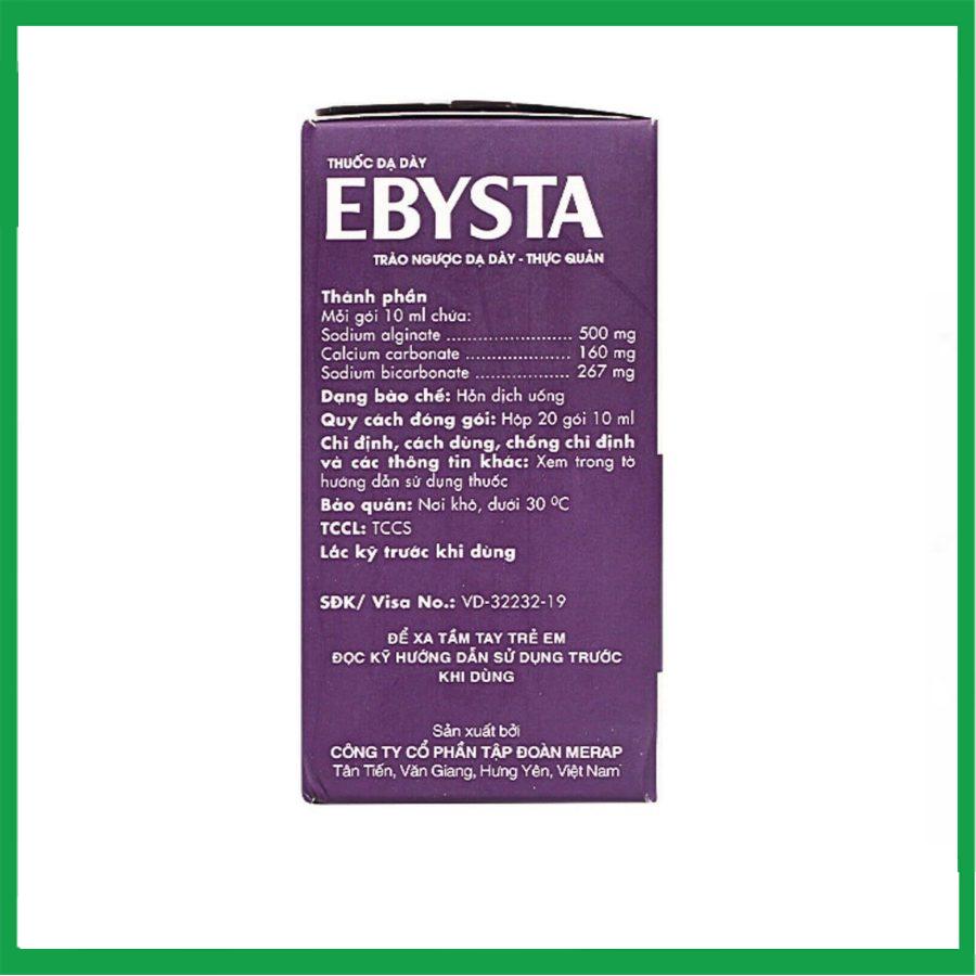 Thuốc Ebysta là sản phẩm của Công ty cổ phần tập đoàn Merap, có thành phần chính là Sodium alginate, Calcium carbonate và Sodium bicarbonate. Thuốc Ebysta chỉ định điều trị trào ngược dạ dày thực quản, ợ nóng ợ chua), đầy hơi liên quan đến sự trào ngược, ợ nóng trong khi mang thai, tất cả các trường hợp đau vùng thượng vị và phía sau xương ức liên quan đến trào ngược dạ dày.