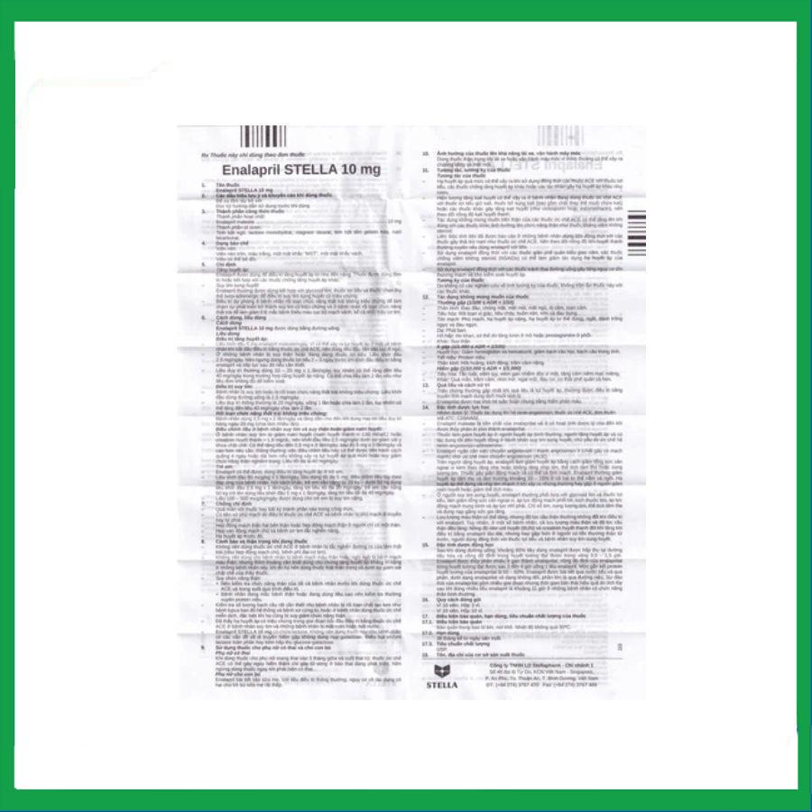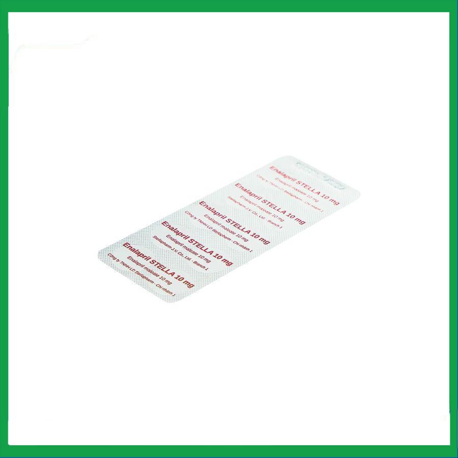 Enalapril Stella 10mg của Công ty TNHH Liên doanh Stellapharm, thành phần chính Enalapril Maleat, là thuốc dùng để điều trị tăng huyết áp, suy tim sung huyết, điều trị dự phòng ở bệnh nhân rối loạn chức năng thất trái không triệu chứng để làm chậm sự phát triển trở thành suy tim có triệu chứng và ở bệnh nhân rối loạn chức năng thất trái để làm giảm tỷ lệ mắc bệnh thiếu máu cục bộ mạch vành, kể cả nhồi máu cơ tim.