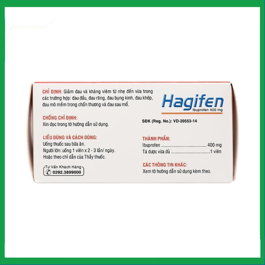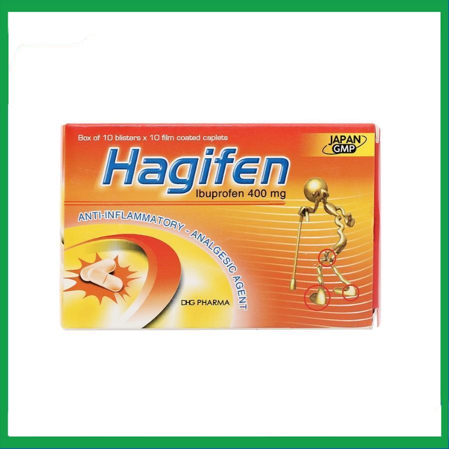 Hagifen 400 mg Dhg 10x10 của công ty TNHH MTV dược phẩm DHG, thành phần chính ibuprofen, là thuốc được sử dụng để giảm đau và kháng viêm từ nhẹ đến vừa trong các trường hợp: Đau đầu, đau răng, đau bụng kinh, đau khớp, đau mô mềm trong chấn thương và đau sau mổ.