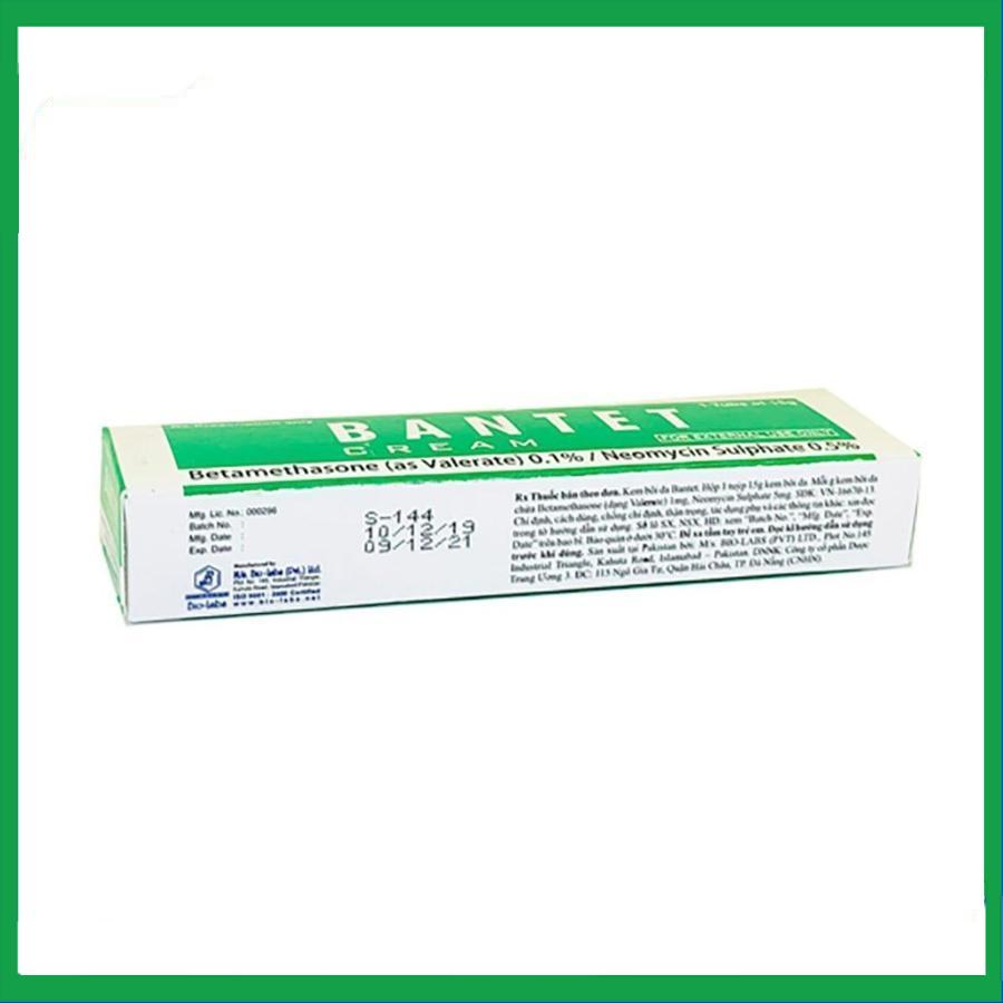 Bantet Cream là sản phẩm của Công ty M/s Bio-Labs (Pvt) Ltd., với thành phần chính chứa betamethasone (dưới dạng betamethasone valerate), neomycin sulfate, là thuốc dùng để trị các bệnh ngoài da do nhiễm khuẩn thứ phát, bệnh có nguy cơ cao hoặc nghi ngờ bị nhiễm các bệnh ngoài da.