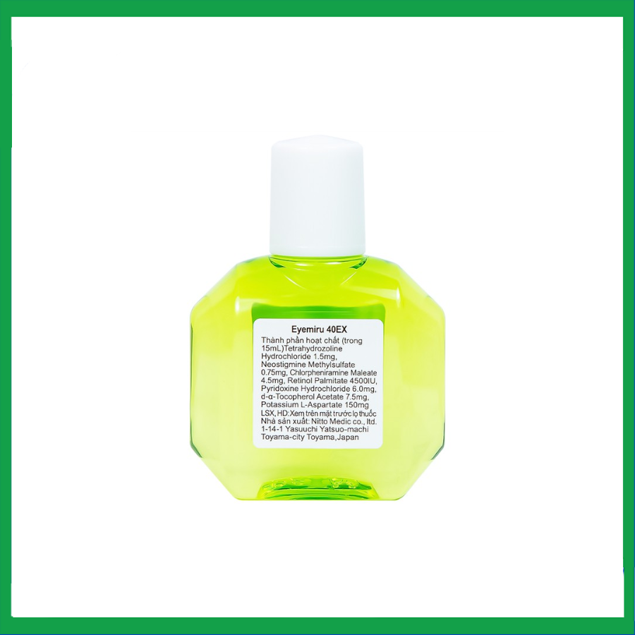 Thuốc EYEMIRU 40 EX là sản phẩm được sản xuất bởi Nitto Medic Co., Ltd. (Nhật Bản), thành phần chính là Tetryzoline hydrochloride; Neostingmine Methylsulfate; Chlorpheniramine Maleate; Retinol Palmitate; Pyridoxine hydrochloride; d-α -Tocoperol Acetate; Potassium L-Aspratate 150mg.