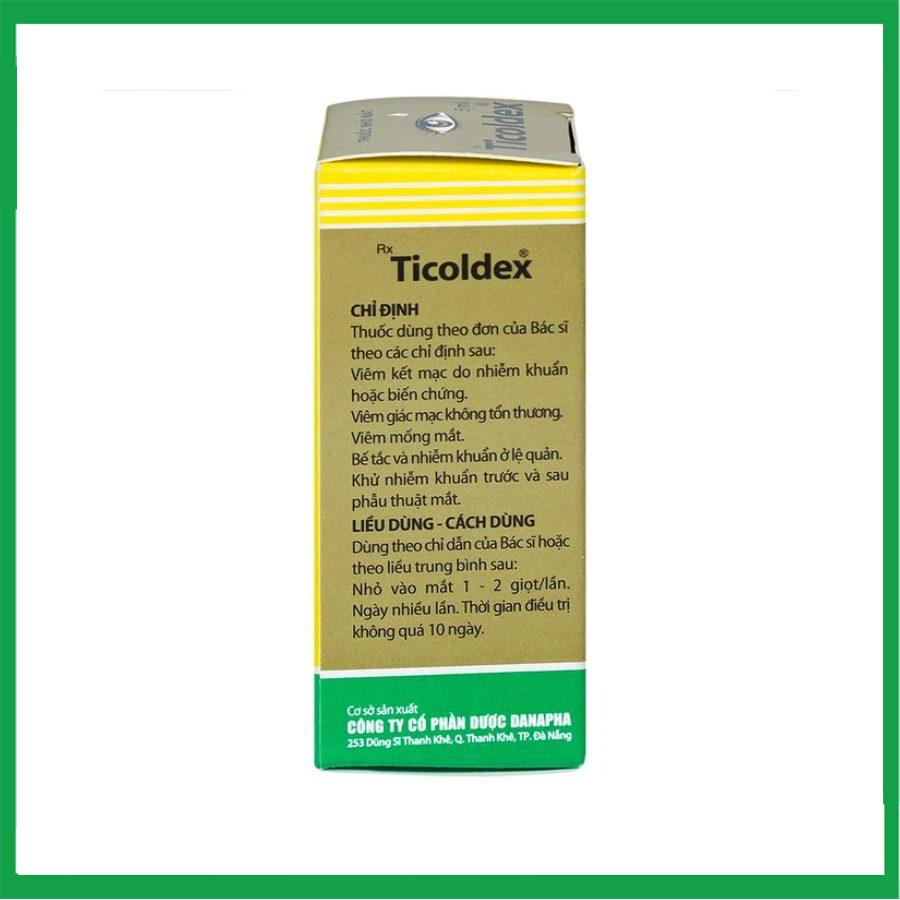 Thuốc nhỏ mắt Ticoldex là dung dịch nhỏ mắt chứa Dexamethason natri phosphat (5 mg/5 ml) và Cloramphenicol (20 mg/5 ml), do Công ty Cổ phần Dược Danapha sản xuất. Thuốc kết hợp corticosteroid chống viêm và kháng sinh phổ rộng, được chỉ định điều trị các bệnh viêm nhiễm mắt như viêm kết mạc, viêm giác mạc không tổn thương, viêm mống mắt, nhiễm khuẩn lệ quản, hoặc khử nhiễm khuẩn trước/sau phẫu thuật mắt. Thuốc nhỏ mắt Ticoldex giúp giảm viêm, tiêu diệt vi khuẩn nhạy cảm với Cloramphenicol như Staphylococcus aureus, Streptococcus pneumoniae, Haemophilus influenzae.