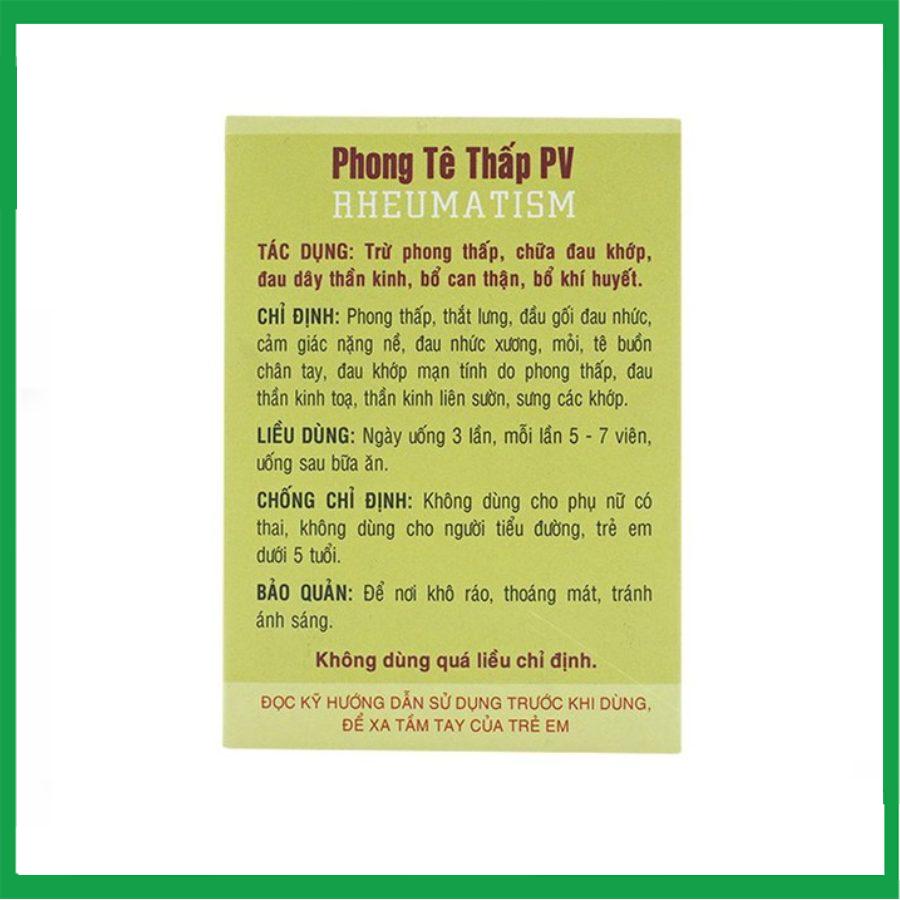 Phong tê thấp PV có tác dụng trừ phong thấp, chữa đau khớp, đau dây thần kinh, bổ can thận, bổ khí huyết để điều trị phong thấp, thắt lưng, đầu gối đau nhức, cảm giác nặng nề, đau nhức xương, mỏi, tê buồn chân tay, đau khớp mạn tính do phong thấp, đau thần kinh tọa, thần kinh liên sườn, sưng các khớp.