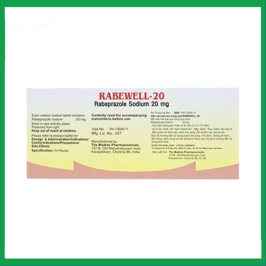 Thuốc Rabewell - 20 được sản xuất bởi Công ty The Madras Pharmaceuticals, có thành phần chính là rabeprazole, được chỉ định để điều trị bệnh trào ngược dạ dày thực quản (GERD) gây loét hoặc ăn mòn, điều trị bệnh trào ngược dạ dày thực quản (GERD) sinh triệu chứng, điều trị bệnh loét tá tràng, diệt trừ helicobacter pylori để làm giảm nguy cơ tái phát loét tá tràng, điều trị các tình trạng tăng tiết bệnh lý, kể cả hội chứng Zollinger - Ellison.