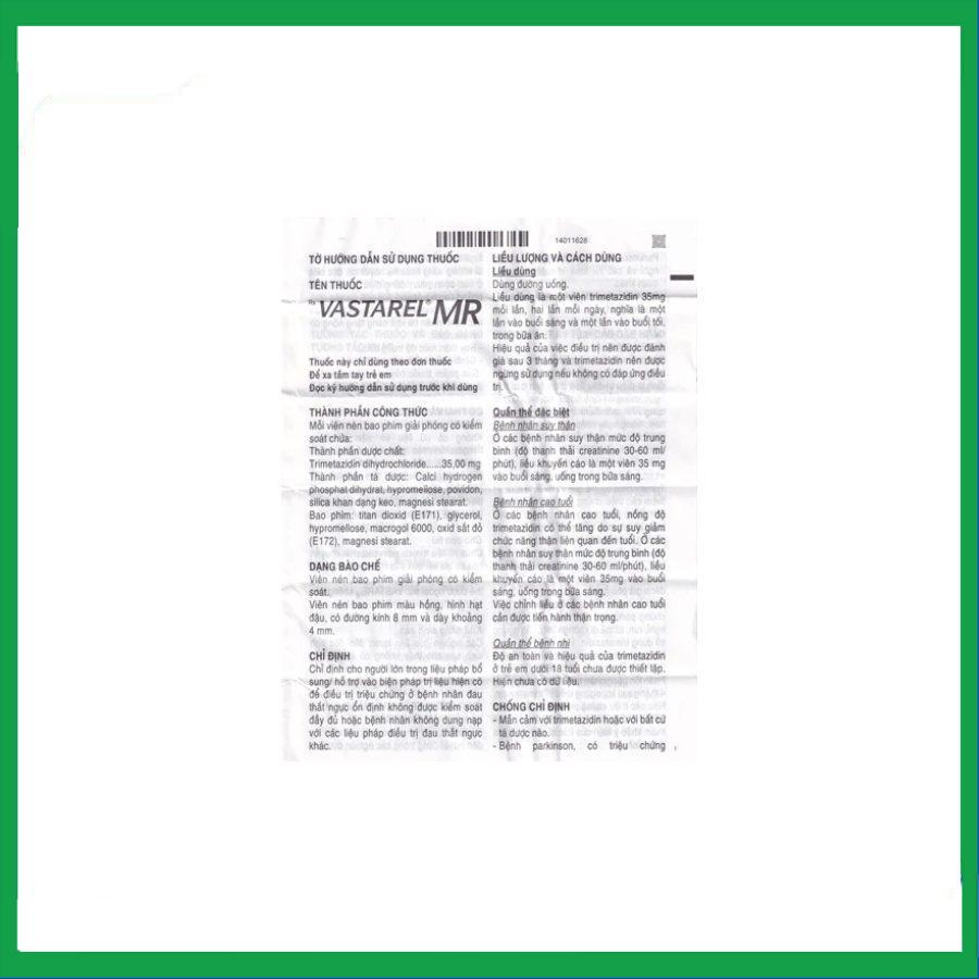Vastarel Mr của Công ty TNHH Servier, thành phần chính Trimetazidin, là thuốc dùng để điều trị triệu chứng ở bệnh nhân đau thắt ngực ổn định không được kiểm soát đầy đủ hoặc bệnh nhân không dung nạp với các liệu pháp điều trị đau thắt ngực khác.Thuốc được bào chế dưới dạng viên nén bao phim giải phóng có biến đổi. Viên nén bao phim màu hồng, hình hạt đậu, có đường kính 8 mm và dày khoảng 4 mm.
