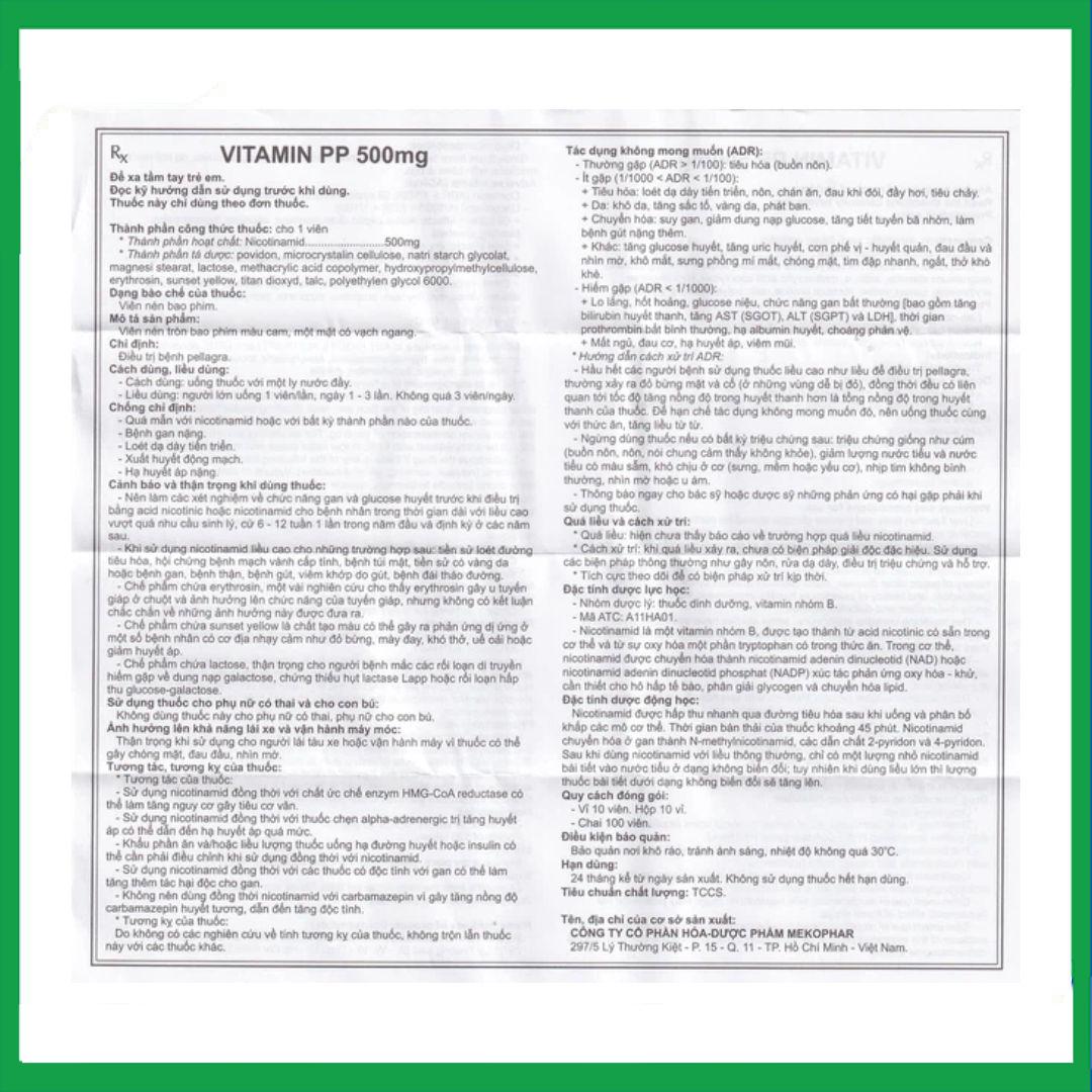 Thuốc Vitamin PP 500mg được sản xuất bởi Công ty Cổ phần Hóa - dược phẩm Mekophar, có thành phần chính là nicotinamid, được chỉ định dùng trong trường hợp điều trị bệnh pellagra.