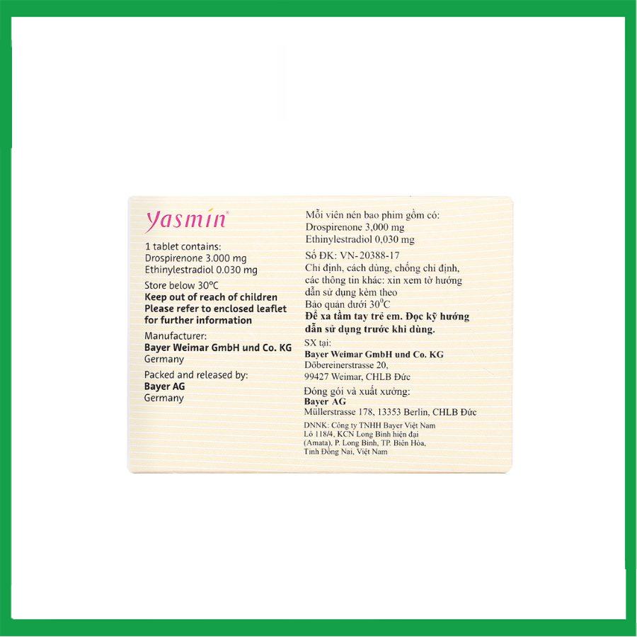 Thuốc Yasmin được sản xuất bởi công ty Bayer, thành phần chính là drospirenone và ethinylestradiol, được chỉ định để tránh thai đường uống.