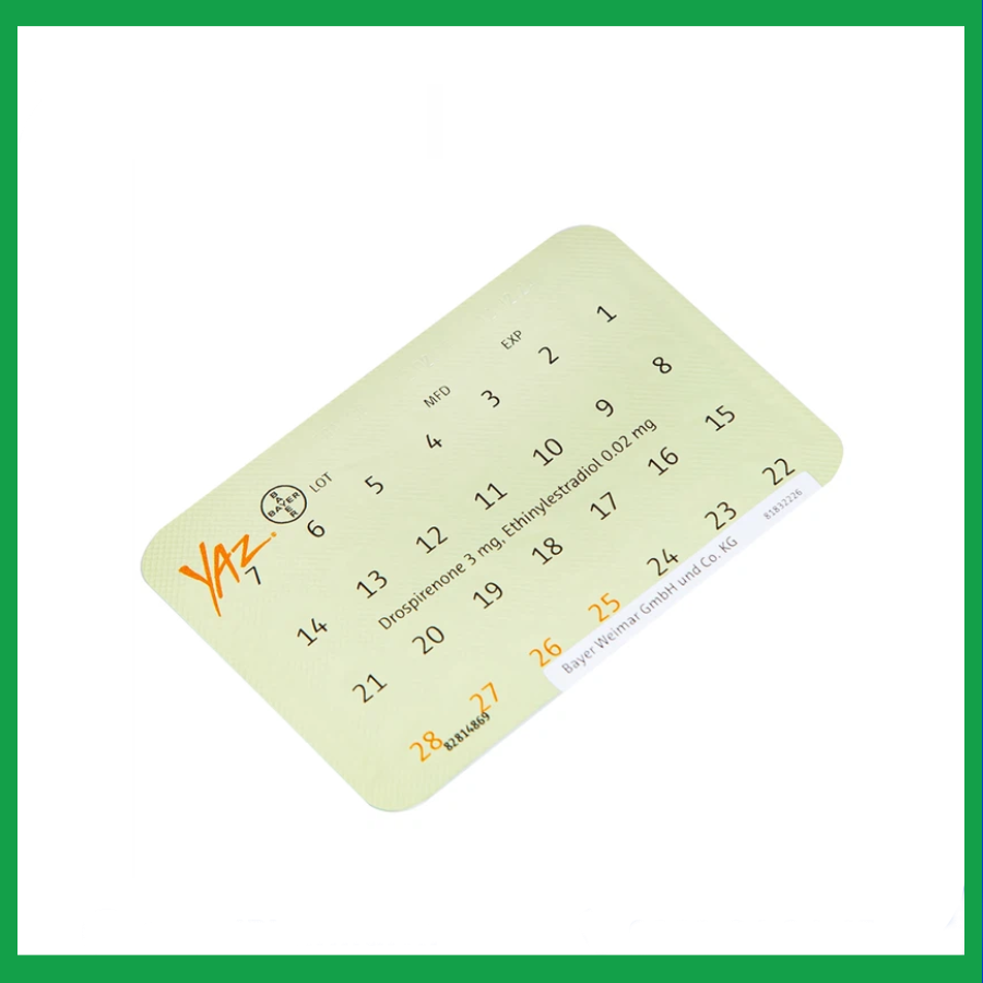 Yaz của Bayer Weimar GmbH und Co. KG., thành phần chính là ethinylestradiol và drospirenone. Yaz là thuốc tránh thai đường uống, điều trị mụn trứng cá mức độ trung bình liên quan đến hormone và điều trị các triệu chứng của hội chứng PMDD (rối loạn tâm lý tiền hành kinh).