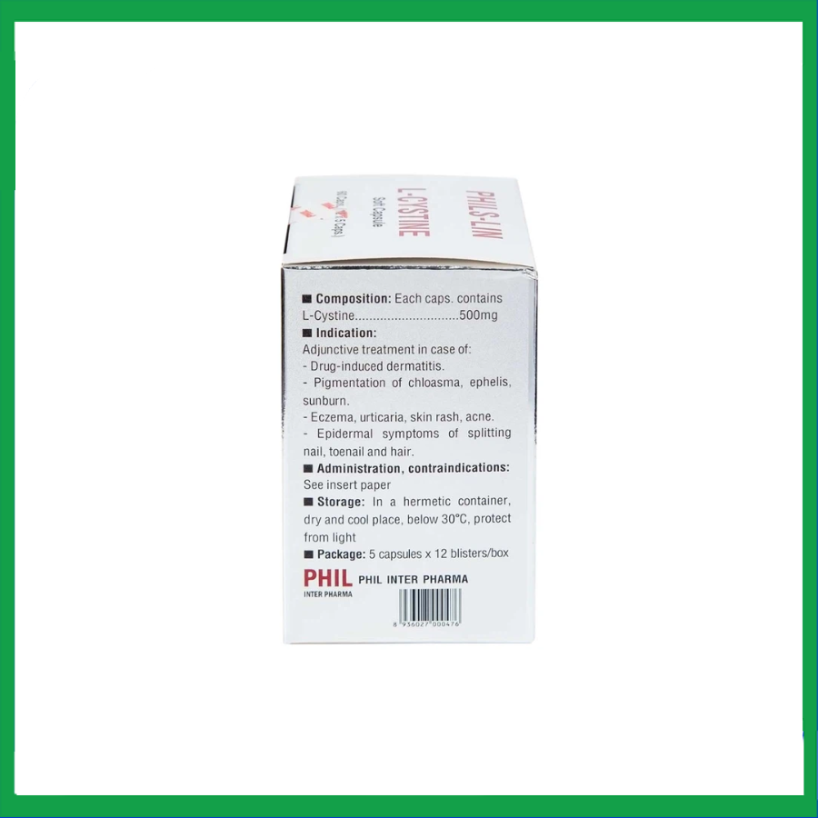 L-Cystine 500mg do Công ty TNHH Phil Inter Pharma sản xuất. Thuốc có tác dụng hỗ trợ trong các trường hợp: Viêm da do thuốc, sạm da, tàn nhang, sạm nắng, eczema, mề đay, phát ban da, mụn trứng cá. Các bệnh biểu bì làm móng tóc khô giòn dễ gãy.
