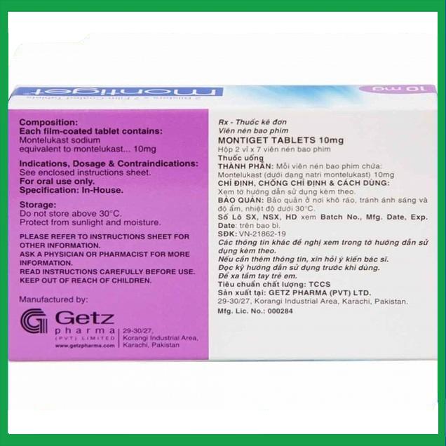 Montiget Tablets 10 mg được sản xuất bởi Getz Pharma (PVT.) LTD., với thành phần chính Montelukast, là thuốc được chỉ định điều trị cho người trưởng thành trong việc phòng và điều trị suyễn mạn tính, làm giảm các triệu chứng viêm mũi dị ứng theo mùa. Viên nén bao phim hình vuông, màu kem, một mặt có khắc một đường rãnh ở chính giữa.2. Thuốc Montiget 10mg mua ở đâu? Giá bao nhiêu?